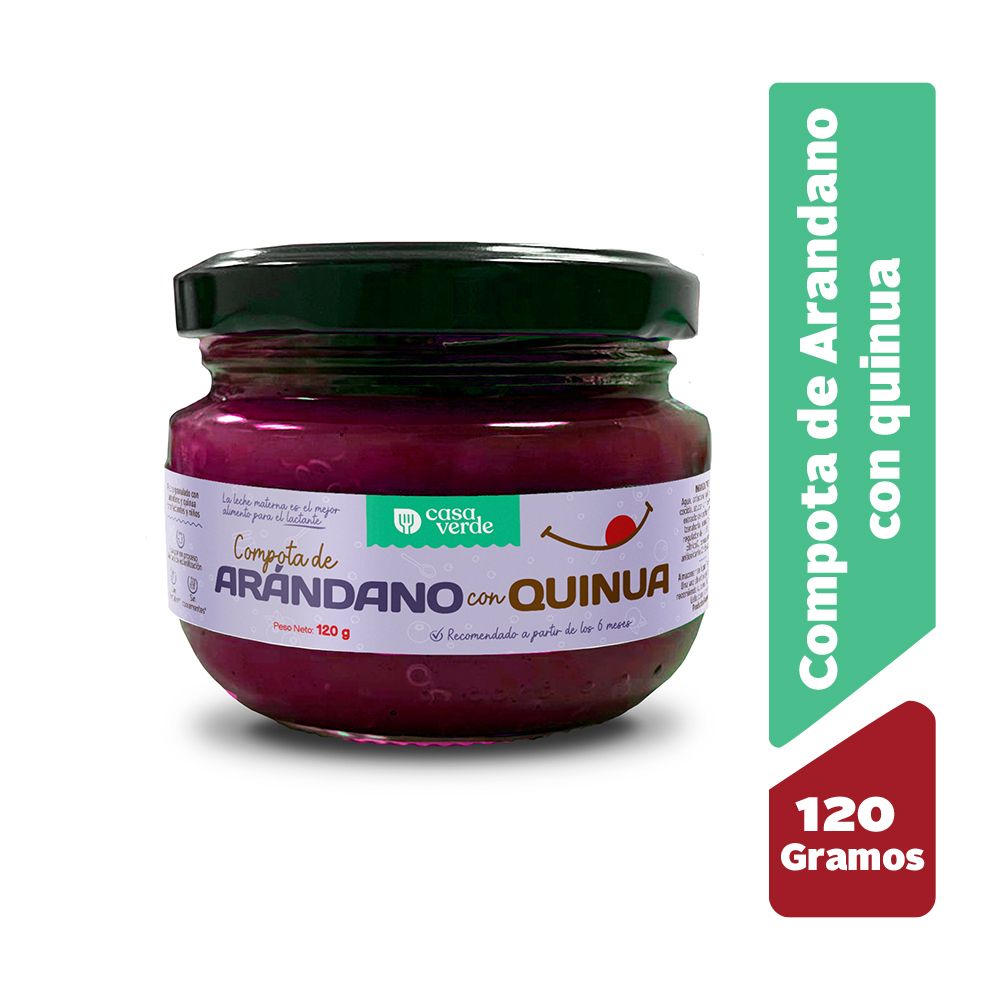 Compota o mazamorra a base de quinua blanca, arándano, extracto de verduras y frutas y canela. Apto para bebés y niños.