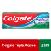 Remueve bacterias que causan el mal aliento en tu boca con la Crema Dental Colgate Triple Acción, disfruta de su presentación con 22 ml que brindará máxima protección y el cuidado más completo. Mejora la apariencia de tu sonrisa usando la crema dental Triple Acción por lo menos 3 veces al día o después de cada comida, en cada uso tendrás 3 beneficios, como aliento completamente fresco, debido a su sabor menta original que se quedará en tu boca por más tiempo, evita la formación de caries, ya que está formulada con flúor y calcio que se adhieren a tus dientes reforzando el esmalte dental. Además, esta crema dental blanquea los dientes, revelando su tono natural. Deléitate diariamente de todos los beneficios que solamente los productos Colgate pueden darle a tu boca. Complementa tu cuidado con un enjuague bucal, hilo dental y cepillo dental.