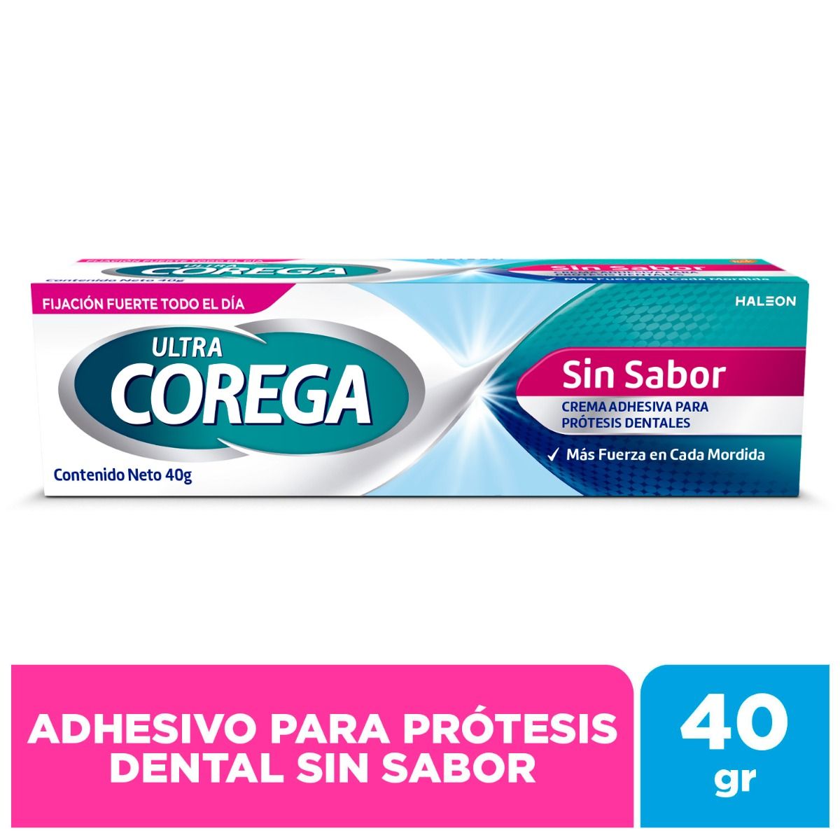 El adhesivo para prótesis dentales Ultra Corega Crema Sin Sabor de 40g. fija la prótesis hasta por 12 horas. Además forma un sello entre la prótesis y la encía previniendo la entrada de partículas de comida.