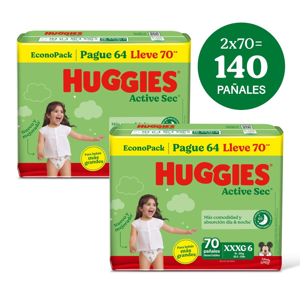 Dúo Pack Pañal Huggies Active Sec EconoPack Talla XXXG - Bolsa 70 UN