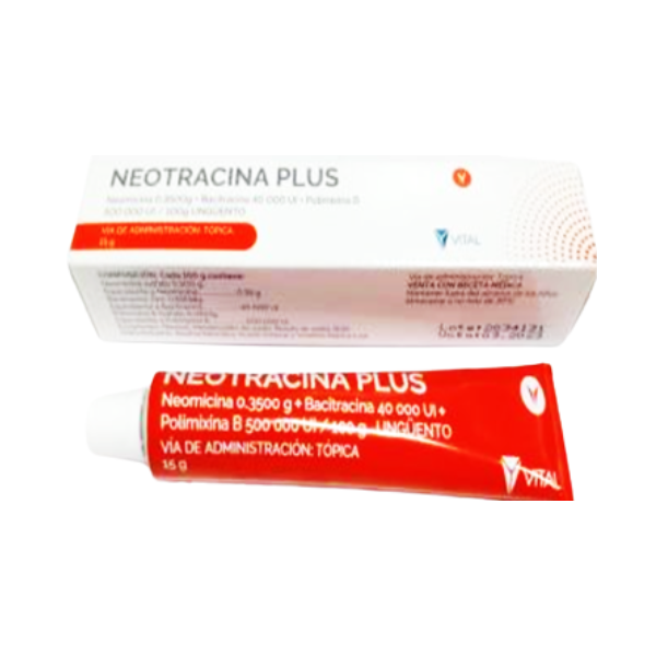 Contraindicaciones | No se recomienda el uso en niños menores de 2 años. Hipersensibilidad a las polimixinas, bacitracina o neotracina o a cualquiera de los excipientes. No usar en caso de infecciones de la mama durante la lactancia. Debido al riesgo de ingestión del producto por parte de los recien nacidos. No usar Neotrracina Plus en las siguientes situaciones clínicas: No use internamente, en los ojos, en grandes areas del cuerpo o en heridas por punción, mordeduras de animales o quemaduras graves durante mas de 1 semana, a menos que lo indique el médico. |