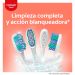Precauciones | Ponga el cepillo en un ángulo de 45 ° con respecto a la línea de las encías. Mueva el cepillo de atrás hacia adelante, y repita dichos movimientos en cada diente. Cepille la superficie interna de cada diente, usando la misma técnica de atrás hacia adelante. Cepille la superficie masticatoria (parte de arriba) del diente. Use la punta del cepillo para cepillar la parte de atrás de cada diente –con cepilladas de adelante y atrás, arriba y abajo, en la parte superior e inferior. No se olvide de cepillar la lengua para quitar el mal olor causado por las bacterias. |