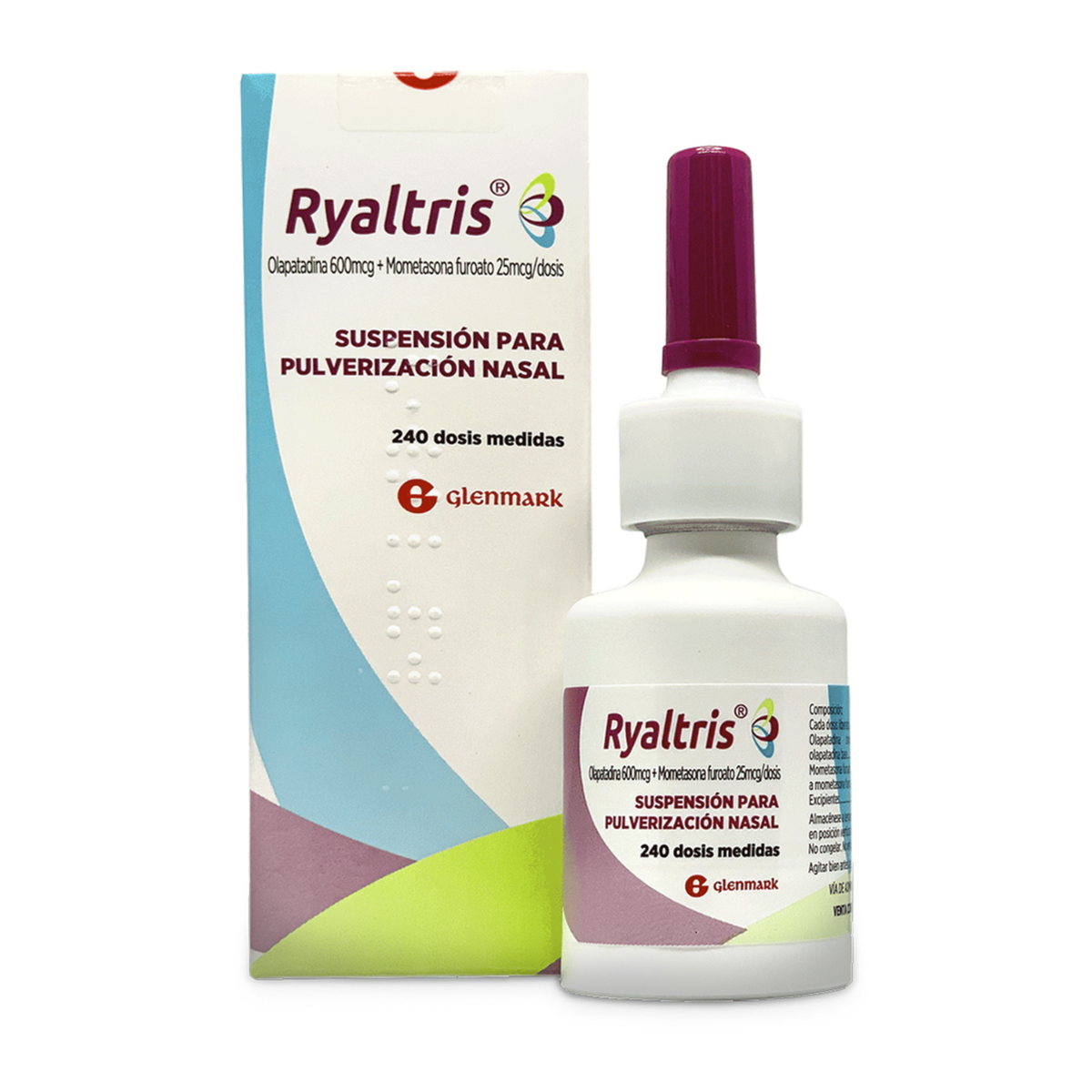 Efectos nasales locales Se han informado casos de ulceración nasal y perforación del tabique nasal en pacientes luego de la aplicación intranasal de antihistamínicos. Se han informado casos de perforación del tabique nasal después de la aplicación intranasal de corticosteroides. Se han notificado casos de epistaxis en pacientes después de la aplicación intranasal de antihistamínicos y corticosteroides (ver sección 3.8). Debido al efecto inhibitorio de los corticosteroides en la cicatrización de heridas, los pacientes que recientemente han experimentado úlceras del tabique nasal, cirugía nasal o traumatismo nasal deben evitar el uso de RYALTRIS® hasta que se hayan sanado. El furoato de mometasona no debe usarse en presencia de infección localizada no tratada que afecte a la mucosa nasal. No hubo evidencia de atrofia en la mucosa nasal después de 12 meses de tratamiento con spray nasal de furoato de mometasona. El furoato de mometasona tendió a revertir la mucosa nasal acercando su fenotipo al de uno histológicamente normal. Al igual que con cualquier tratamiento a largo plazo, los pacientes que usan el spray nasal de furoato de mometasona durante varios meses o más deben ser examinados periódicamente para detectar posibles cambios en la mucosa nasal. Si se desarrolla una infección micótica localizada en la nariz o la faringe, puede que sea necesario suspender el tratamiento con RYALTRIS® o que se requiera tratamiento adecuado. La persistencia de la irritación nasofaríngea puede ser una indicación para descontinuar RYALTRIS®. Alteraciones visuales, que incluyen glaucoma, cataratas y trastornos coriorretinianos. Se pueden reportar alteraciones visuales con el uso de corticosteroides sistémicos y tópicos (se incluye intranasales, inhalados e intraoculares). Si un paciente presenta síntomas como visión borrosa u otras alteraciones visuales, se debe considerar la derivación a un oftalmólogo para evaluar las posibles causas de alteraciones visuales que pueden incluir cataratas, glaucoma o enfermedades raras como la coriorretinopatía serosa central (CSCR) que se han reportado después del uso de corticosteroides sistémicos y tópicos. Reacciones de hipersensibilidad Pueden producirse reacciones de hipersensibilidad, incluidos casos de sibilancias, después de la administración intranasal de furoato de mometasona monohidrato. Suspenda RYALTRIS® si tales reacciones ocurren (ver sección 3.3). Inmunosupresión Se debe advertir a los pacientes que reciben corticosteroides quienes son potencialmente inmunosuprimidos sobre el riesgo de exposición a ciertas infecciones (tales como varicela, sarampión) y sobre la importancia de obtener asesoramiento médico si se produce dicha exposición. Los corticosteroides deben usarse con precaución, y posiblemente no usarse, en pacientes con infecciones tuberculosas del tracto respiratorio activas o latentes, o en infecciones fúngicas o bacterianas no tratadas, infecciones sistémicas virales o parasitarias o herpes simple ocular debido a la posibilidad de empeoramiento de estas infecciones. Efectos del eje hipotalámico-hipofisario-adrenal (HPA) Los productos de esteroides intranasales están diseñados para administrar el fármaco directamente a la mucosa nasal a fin de minimizar la exposición general a los glucocorticoides sistémicos y los efectos secundarios. Cuando se usan esteroides intranasales a dosis más altas de lo recomendado o en individuos susceptibles a las dosis recomendadas pueden aparecer efectos sistémicos de corticosteroides como hipercorticismo y supresión suprarrenal. Los médicos deben estar atentos a la evidencia de efectos sistémicos, especialmente en pacientes tratados de manera crónica. Sin embargo, no hay evidencia de supresión del eje hipotalámico-hipofisario-adrenal (HPA) luego de un tratamiento prolongado con spray nasal de furoato de mometasona. Se debe tener cuidado al transferir pacientes del tratamiento con esteroides sistémicos a RYALTRIS® si existe alguna razón para suponer que la función suprarrenal está alterada. Durante la transferencia de corticosteroides sistémicos a corticosteroides intranasales, algunos pacientes pueden experimentar síntomas de abstinencia de corticosteroides sistémicamente activos (tales como dolor articular y/o muscular, lasitud y depresión de manera inicial) a pesar del alivio de los síntomas nasales. Dicha transferencia también puede desenmascarar afecciones alérgicas preexistentes tales como conjuntivitis alérgica y eccema, que previamente fueron suprimidas por la terapia sistémica con corticosteroides. Somnolencia Se ha reportado en estudios clínicos que la somnolencia es poco frecuente después de la administración de RYALTRIS® (ver sección 3.7) Efecto sobre el crecimiento Los corticosteroides intranasales pueden causar una reducción en la velocidad del crecimiento cuando se administran a pacientes pediátricos. Monitorear rutinariamente el crecimiento de pacientes pediátricos que reciben RYALTRIS® (ver sección 4.2). Insuficiencia hepática No se han realizado estudios con RYALTRIS® en pacientes con insuficiencia hepática. Sin embargo, han habido informes de concentraciones de furoato de mometasona que parecen aumentar la gravedad de la insuficiencia hepática. Según los datos de los componentes individuales, no se justifica ningún ajuste del régimen de dosificación de RYALTRIS® en pacientes con insuficiencia hepática (ver sección 4.2). Uso en la tercera edad Según el análisis farmacocinético de la población entre pacientes de 12 años de edad y mayores, la edad no influyó en la farmacocinética de olopatadina y furoato de mometasona con RYALTRIS®. En los datos recopilados de 145 pacientes de 65 años a más en comparación con pacientes más jóvenes que fueron tratados con RYALTRIS® en estudios con placebo y con control activo no se observaron diferencias generales sobre la seguridad o la eficacia. Uso pediá